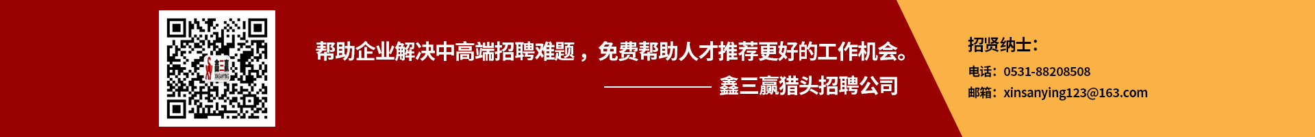 鑫三贏獵頭招聘公司(0531-88208508)是山東本土的知名專業獵頭招聘公司,幫助企業解決中高端招聘難題 ,免費幫助人才推薦更好的工作機會。公司總部位于山東省省會濟南市。我們致力服務于山東省內大中型內外資企業,我們通過對客戶企業的組織結構、相關業務和具體職位的研究、分析,能夠很好的與企業及候選人進行溝通,滿足不同企業對不同種類高級人才的需求,我們的人才儲備來自全國各地(包括和港澳臺同行業合作人才渠道)。我們與多家世界500強、山東知名企業保持著長期獵頭服務戰略合作關系,在山東獵頭業界享有良好的聲譽和口碑。